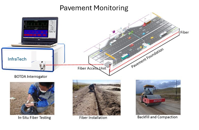 InfraTech helps our clients monitor the subsurface condition of pavement structures with Fiber Optic Sensing technology. The conventional monitoring approach is difficult to pinpoint which layer is defective and find out the root cause when the surface condition is poor. it is insufficient to solely relying on surface condition assessment to make proper decisions on road repair plans or innovative alternatives to the existing construction materials and methodology.